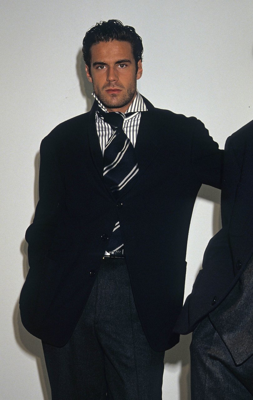 La camicia che sembra inamidata, il doppiopetto e la giacca formali, il bianco come puro, candido, lavato.