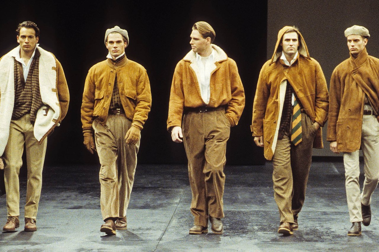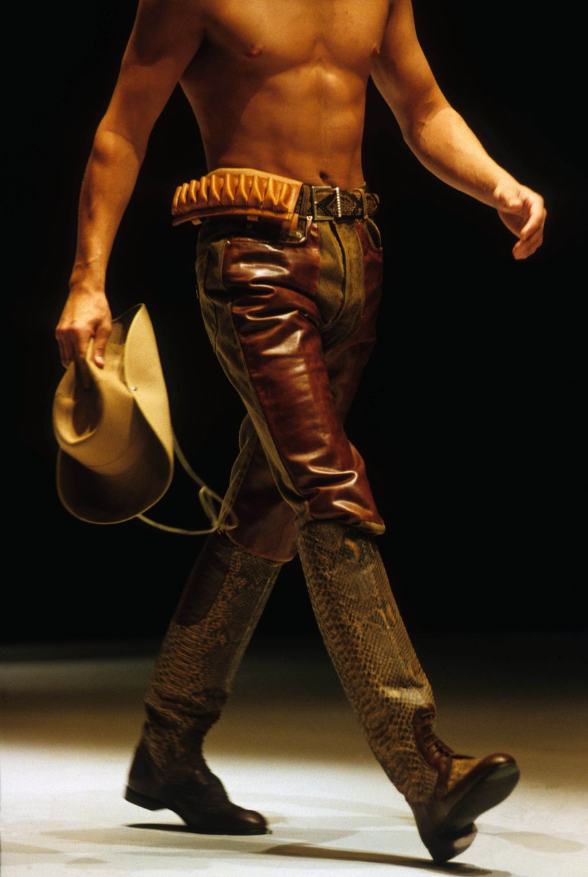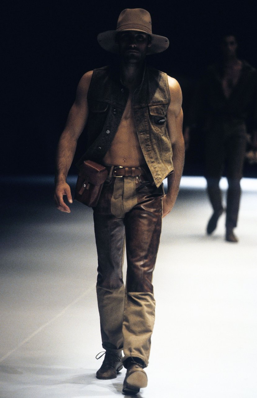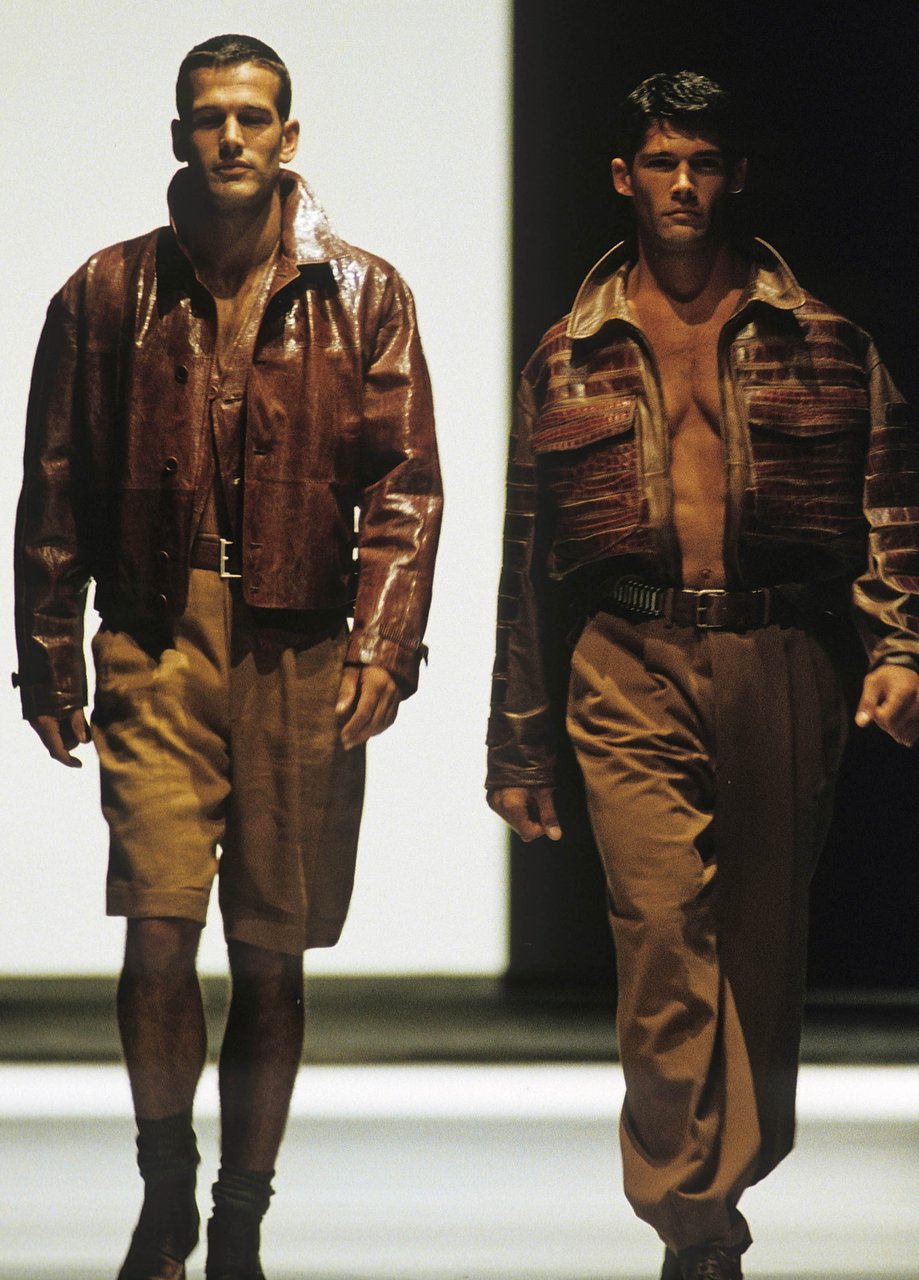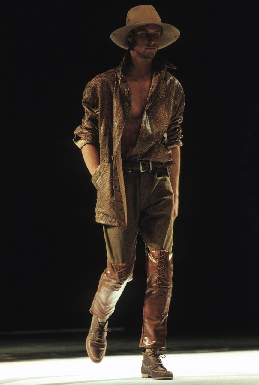 Sprazzi di fantasia con la serie stars and stripes, ma tagliate e ricucite a pezzi, e con i pullover a check, zig-zag e righe. Espressione di forza e dinamismo, il cuoio naturale, uno dei segni di stagione. Con la pelle di camoscio lavata, bucata, foderata di tulle elastico. Il giubbotto-trofeo a strisce di coccodrillo, il gilet da caccia di Wips, una lucertola pregiata; i jeans che sembrano di anaconda, mentre sono realizzati in drill stampato. Seta selvaggia e corposa, o seta ritorta per il Galles e il gessato. Giacche completamente colorate: viola, rosa, rosso, framboise, zucca e verde... in un’esplosione di vitalità, come musica cajun.