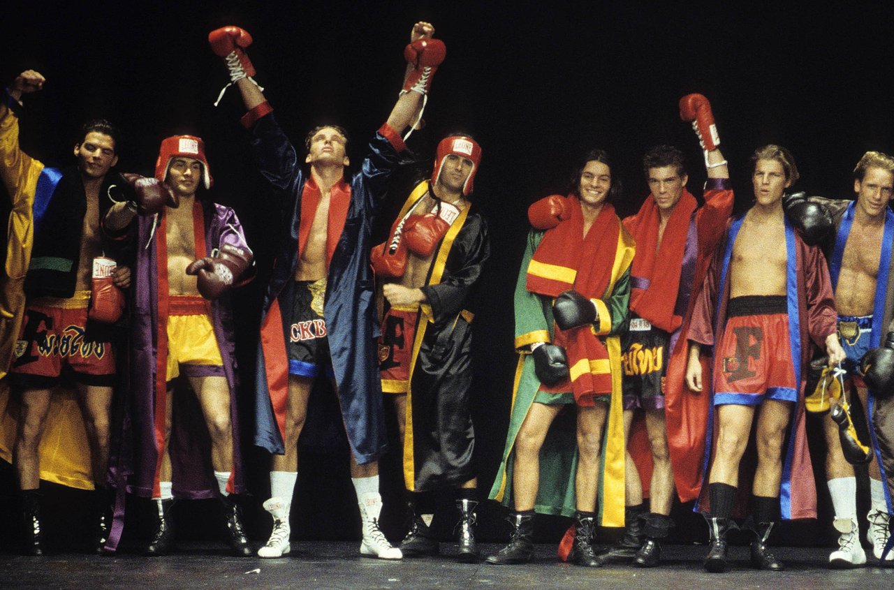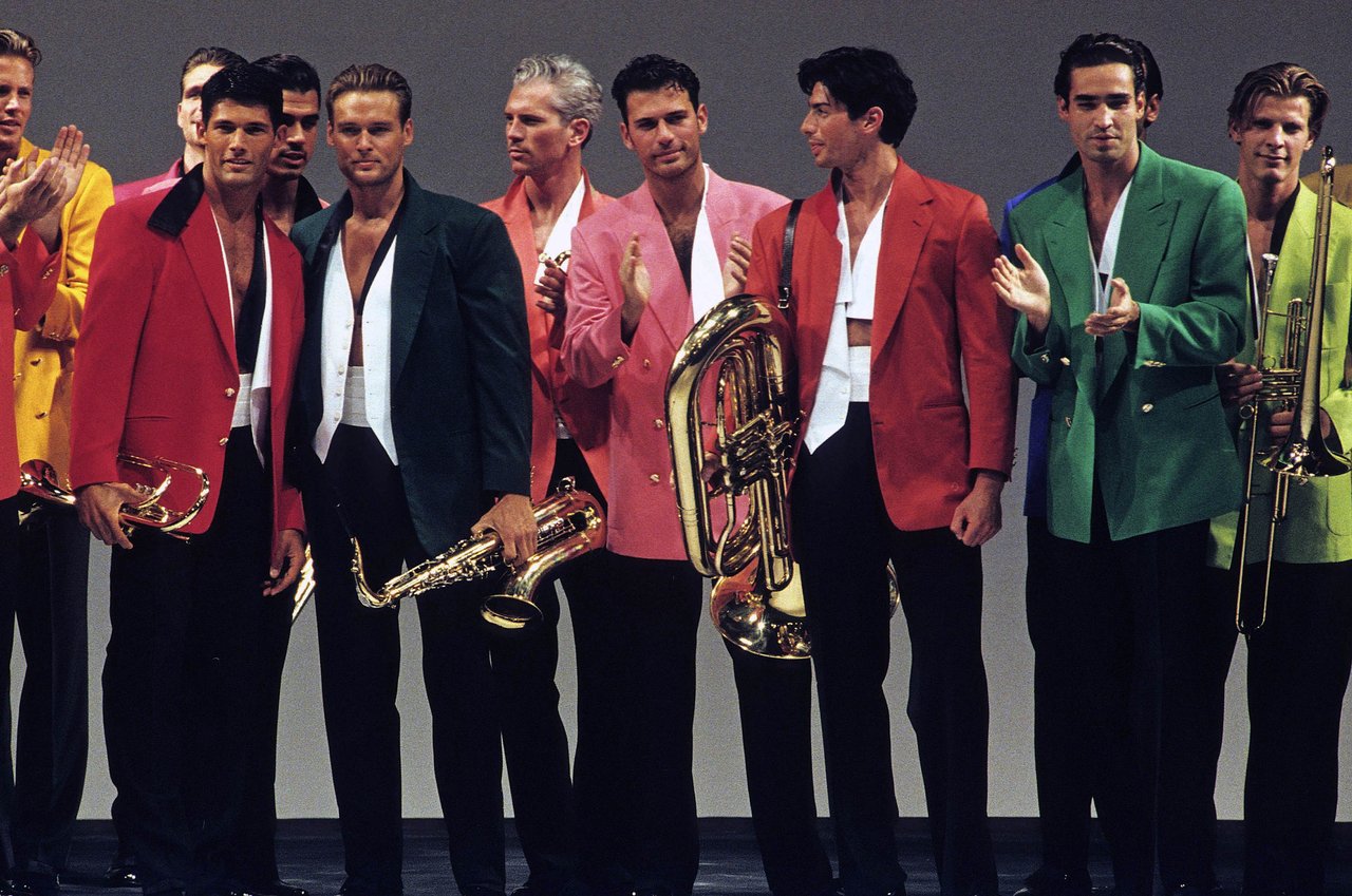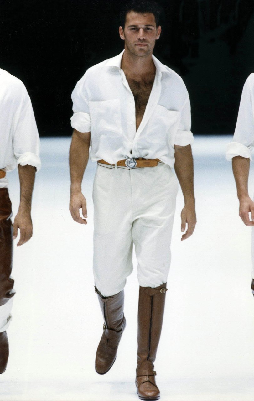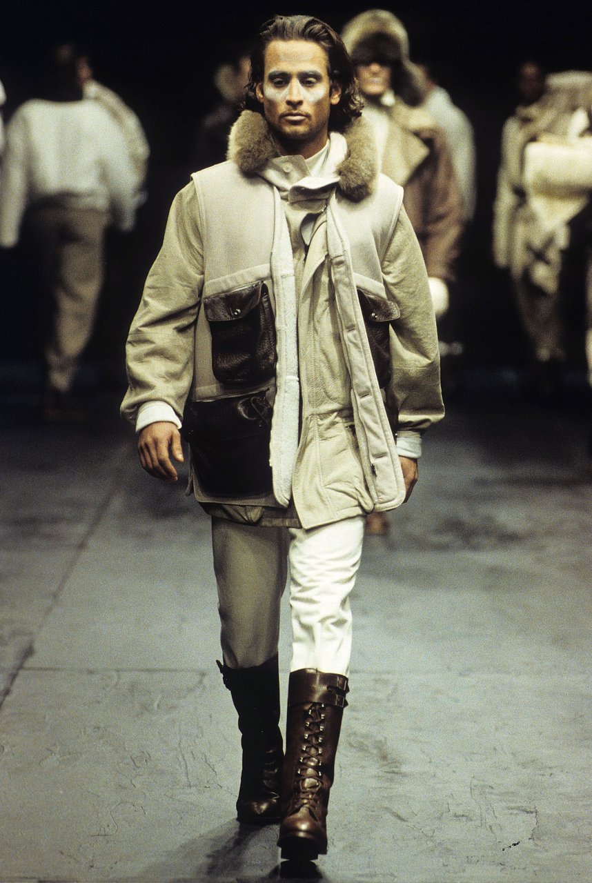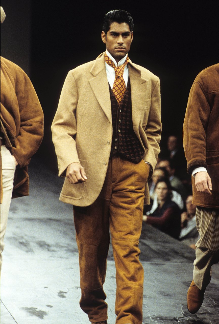 Sprazzi di fantasia con la serie stars and stripes, ma tagliate e ricucite a pezzi, e con i pullover a check, zig-zag e righe. Espressione di forza e dinamismo, il cuoio naturale, uno dei segni di stagione. Con la pelle di camoscio lavata, bucata, foderata di tulle elastico. Il giubbotto-trofeo a strisce di coccodrillo, il gilet da caccia di Wips, una lucertola pregiata; i jeans che sembrano di anaconda, mentre sono realizzati in drill stampato. Seta selvaggia e corposa, o seta ritorta per il Galles e il gessato. Giacche completamente colorate: viola, rosa, rosso, framboise, zucca e verde... in un’esplosione di vitalità, come musica cajun.