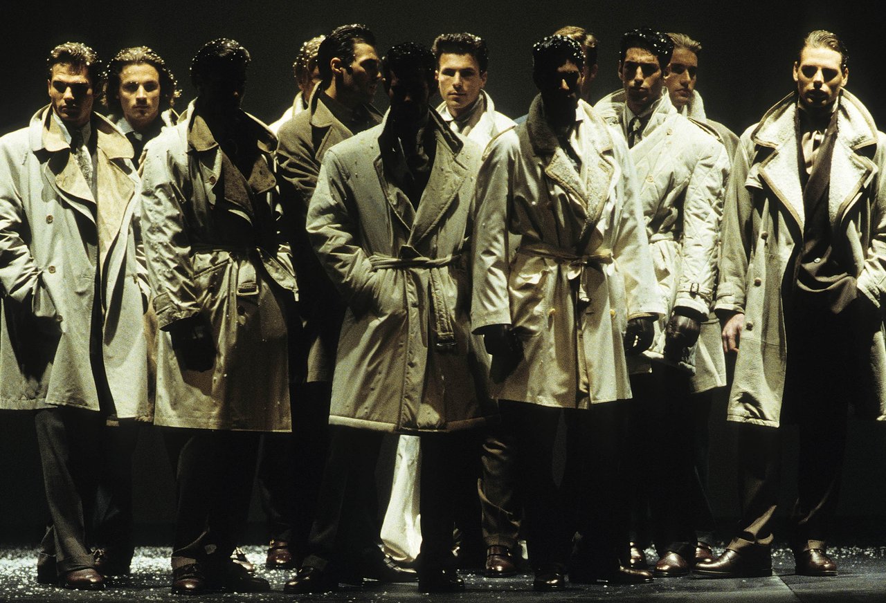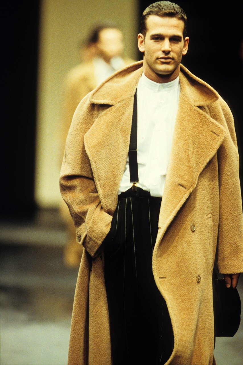 Procedendo per istinti e sensazioni, costruendo il lessico di uno stile che si conferma e si arricchisce naturalmente, stagione dopo stagione, il gusto si delinea con sottigliezza, per passi logici. Così la giacca si allunga e il doppiopetto da quattro bottoni passa a otto. I colori squillanti sono immersi in una patina pastosa, che ha la profondità di un’ombra. I tessuti hanno un corpo e un volume che rendono più morbida la tonalità: il bianco e il nero delle lane spugnose, dei tessuti rigonfi ispirati alle magliette tecniche; il crêpe di lana blu lavorato a microtrecce; il pullover di ciniglie mescolate. Il gessato si moltiplica: blu copiativo sul nero, marrone scurissimo e mattone, verde abbinato al blu, blu a righe rosse o zucca.
