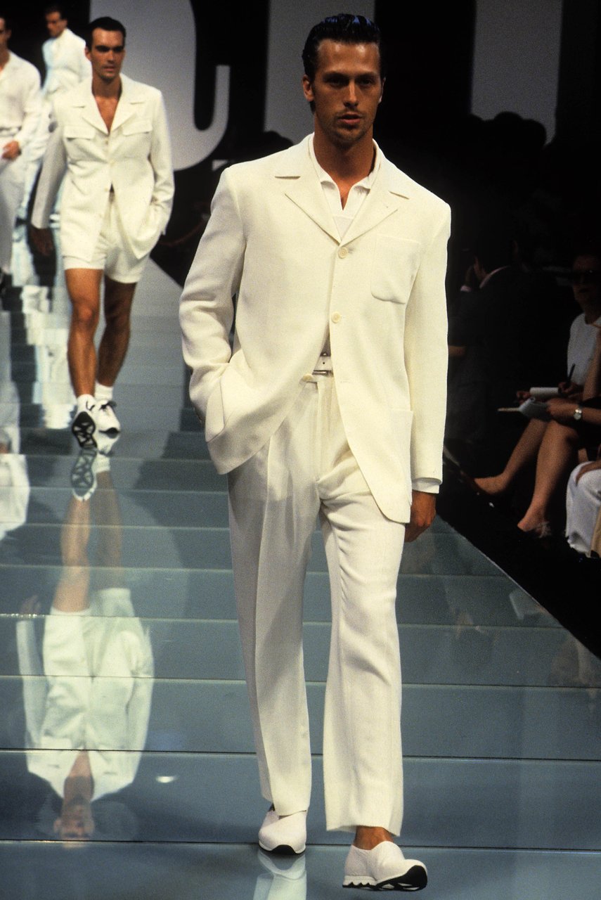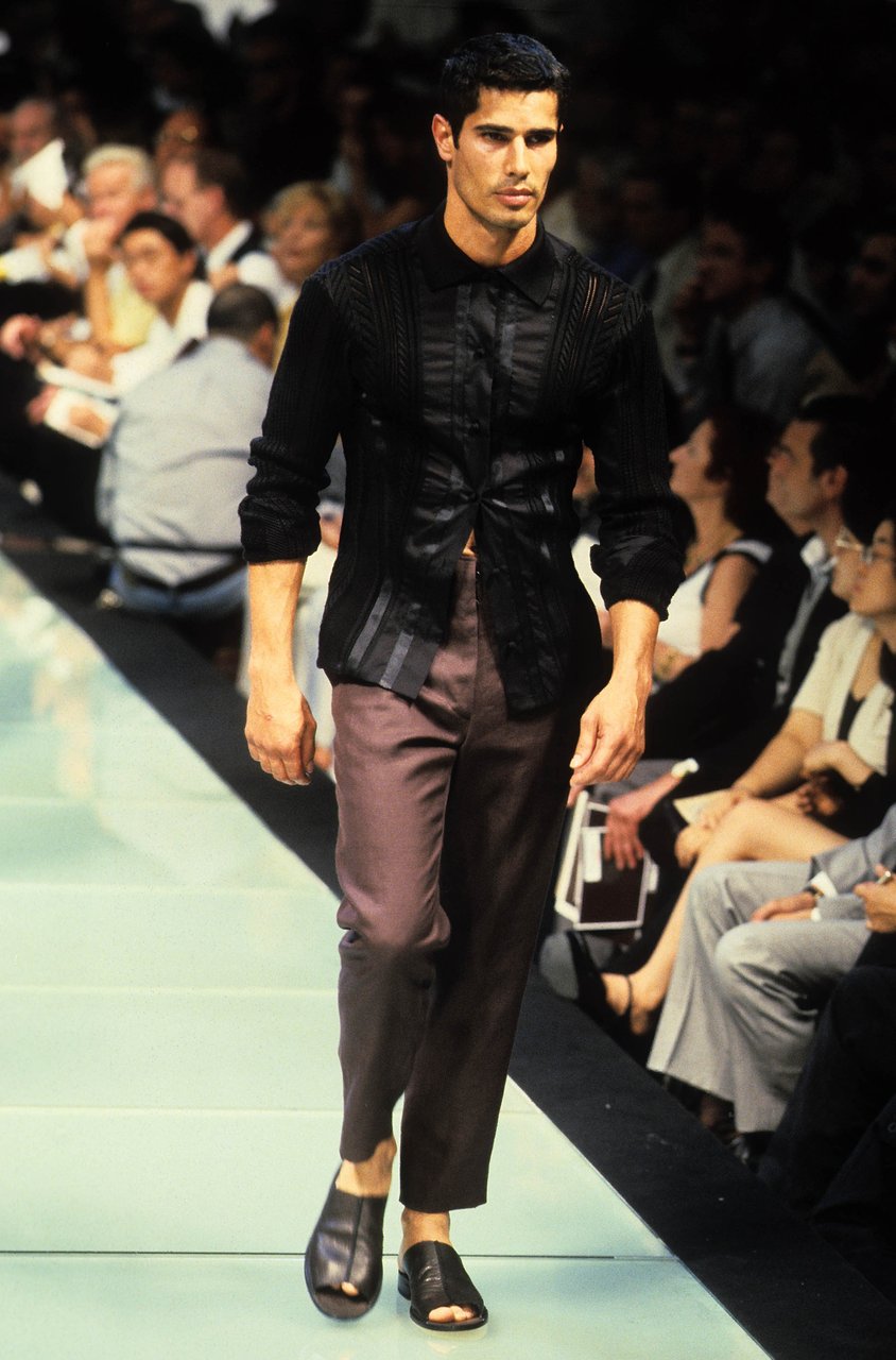 “L’impressione, osservando i vestiti, è che siano stati plasmati: forme ampie, strutturate, ma realizzate con tessuti cadenti, si contrappongono a forme più snelle e vicine al corpo, senza subire la costrizione dello stretch. In una ricerca di naturalezza, le esperienze tecnologiche non sono più esaltate ma contribuiscono a costruire la concretezza, la solidità dei colori e delle linee, la qualità dei tessuti. Ho voluto che soffiasse una brezza mediterranea, leggibile negli accessori, nell’assenza deliberata di decori, in certi atteggiamenti dall’impronta quasi infantile: come la camicia senza colletto sul pantalone blu, o il pantalone nero con la camicia di percalle avorio”.