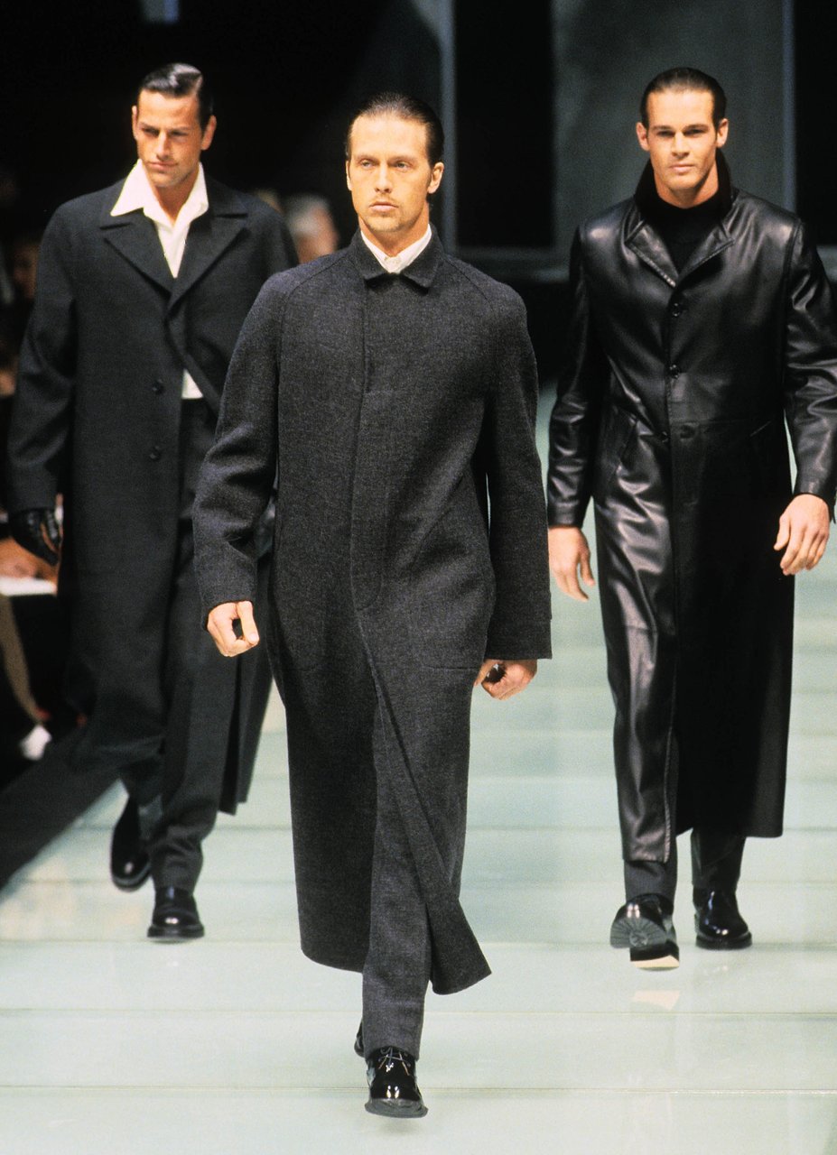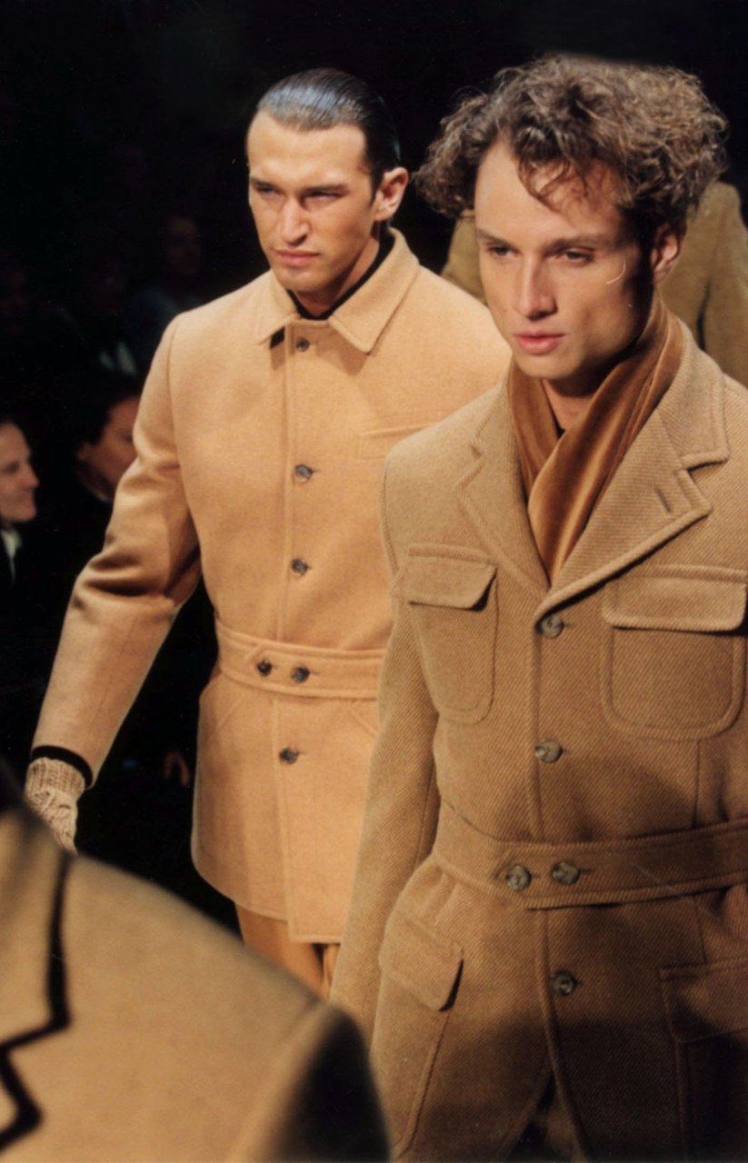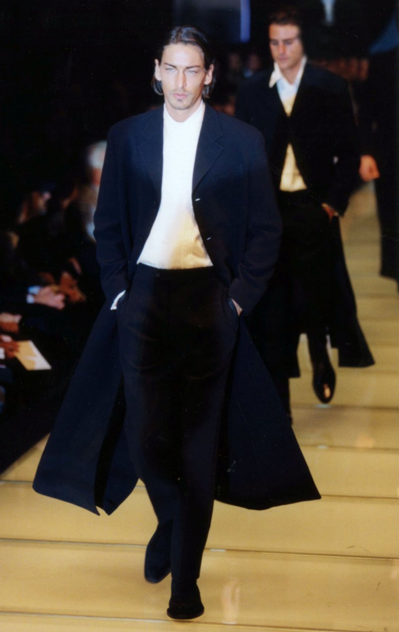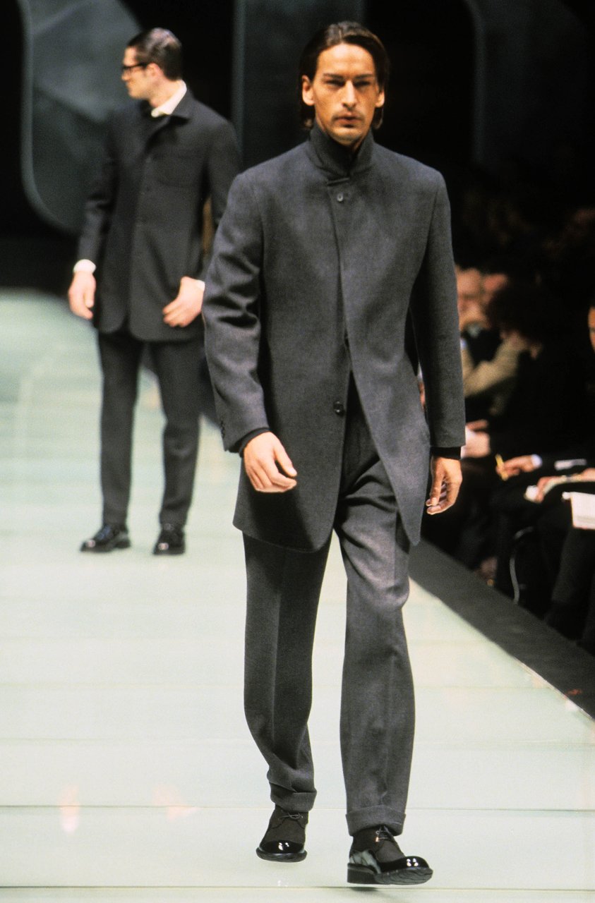 Comfort: ogni capo è volutamente, deliberatamente confortevole, anche quando ha forme molto aderenti, ottenute grazie a moderne modellazioni di origine sartoriale. Logica: negli intendimenti. I colori appartengono all’origine ed alla tradizione del capo e della materia. Qualità: sublimata dalla foggia. Alpaca corposa che può essere usata senza intelaiature; flanelle doppie come panni; lane e cotoni incollati, doppiati e garzati sino a divenire un unico nuovo tessuto per cappotti morbidi e caldi. Effetti: flanelle, grisaglie, millerighe hanno una mano morbida e vellutata, quasi setosa. Simil-broccati per camicie, realizzati sovrapponendo ricami elettronici. Aspetto consistente, soffice, caldo: tutto sembra pesante, ma nasconde un’anima leggera. Libertà: lo stile non deve essere formale per esprimere eleganza, né informale per sdrammatizzare. Il giorno si trova a suo agio nella sera. Cambiano solo gli atteggiamenti, il modo di porsi. Silhouette: allungata, nera, blu, grigia con pardessus che toccano terra. Giacche lunghe, accostate, indossate con attitudine quasi da uniforme militare.