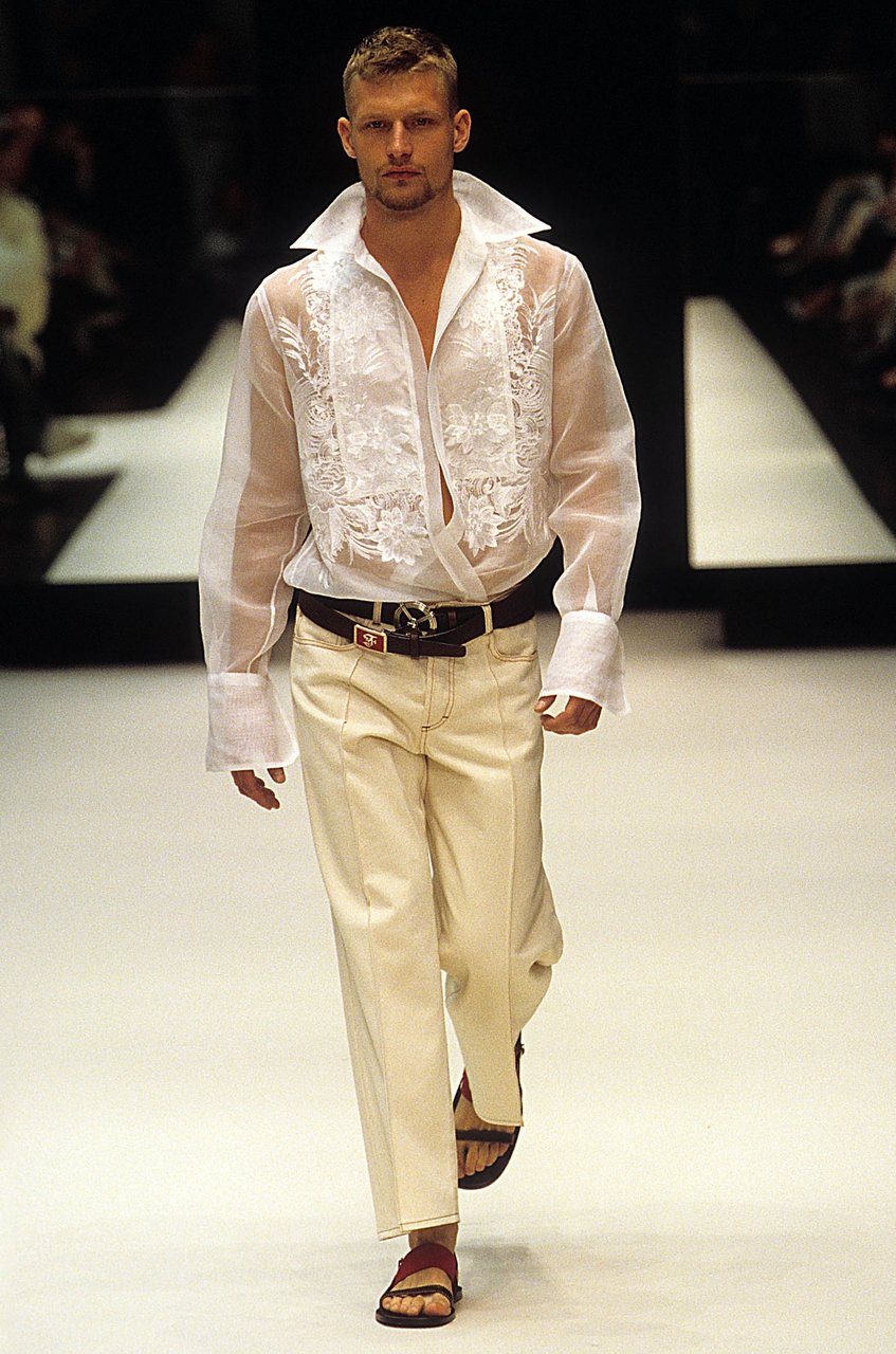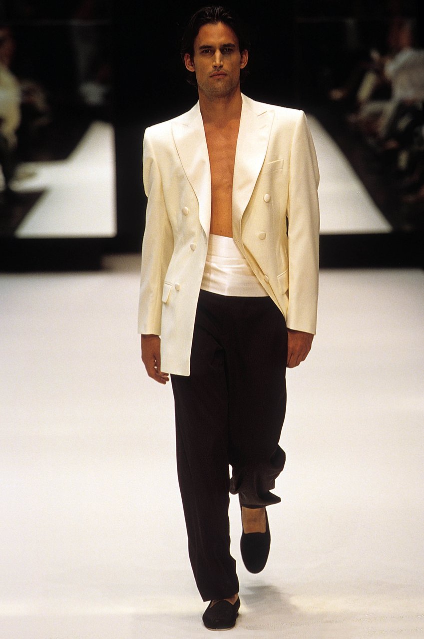 Altrettanto logica, è la scansione dei colori, privilegiando tonalità intense: testa di moro, blu marine, brique che si oppone al grigio. Anche il rosso, quando c’è, rivela una profondità speciale. Questa densità è attenuata con squarci di chiarore, forti e delicati insieme. Così, per accrescere la freschezza del summer suit, il bianco è sfumato nelle più naturali gradazioni del crema, conservandolo invece in tutta la sua luminosità nelle camicie da sera in organza di cotone intagliate ad a-jour e nei tuxedo candidi.