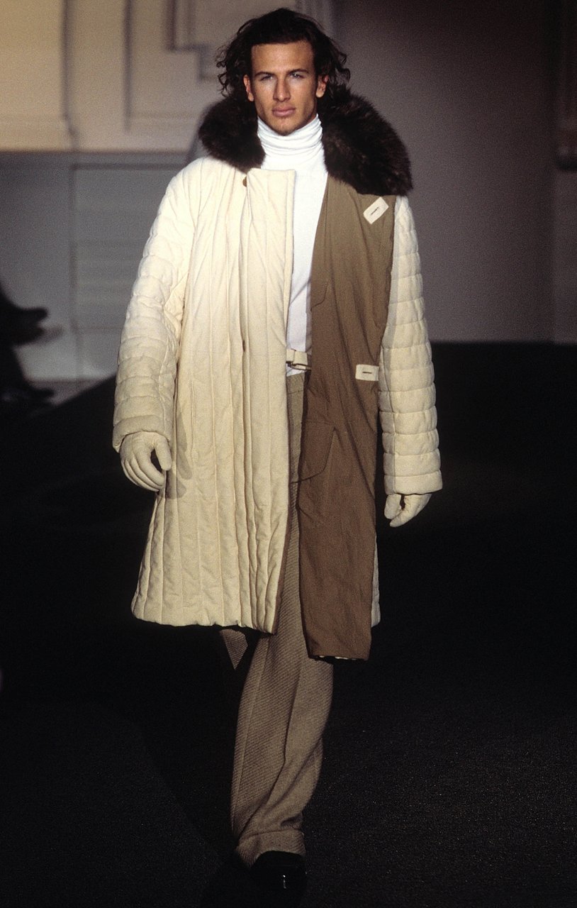 Il risultato è una collezione sensata ed equilibrata, che lascia trasparire con immediatezza le ragioni per cui il guardaroba maschile è fatto di certi capi e di necessità precise. Prima tra tutte quella di declinare anche le tipologie più classiche del vestire urbano con la scioltezza di uno spirito sportivo. Questa ricerca di morbida disinvoltura ha portato a rileggere certi rapporti, ad evitare assonanze scontate tra abito e corpo. Se il capo è sportivo, non è detto che debba essere aderente: al contrario, può acquistare volume e dimensione. C’è una volontà di solidità e di pacatezza che si mostra anche nei colori: oltre al bianco e al nero, il greggio, il verde pino, l’antracite, con colpi e guizzi squillanti di turchese o rosso lacca che ricordano le decorazioni degli alpenstock.
