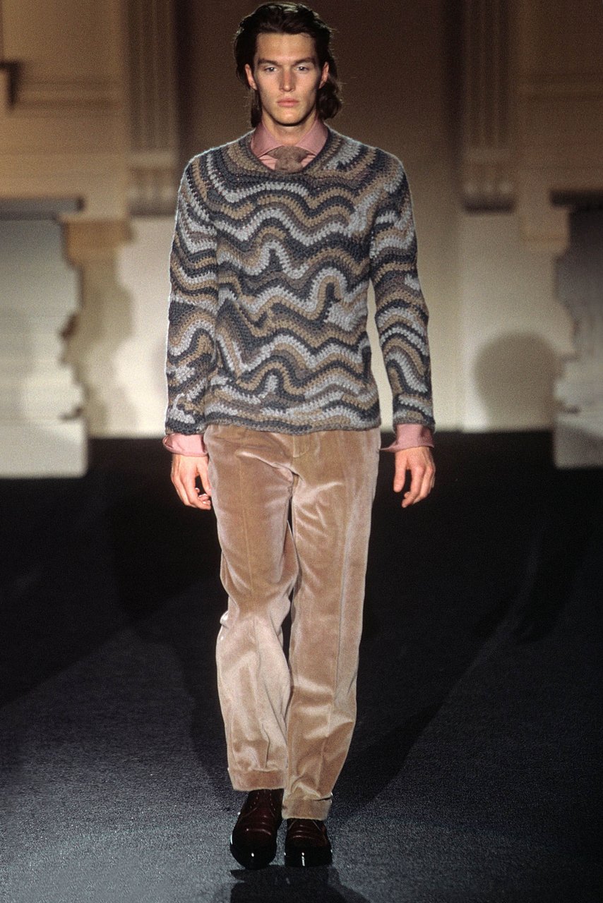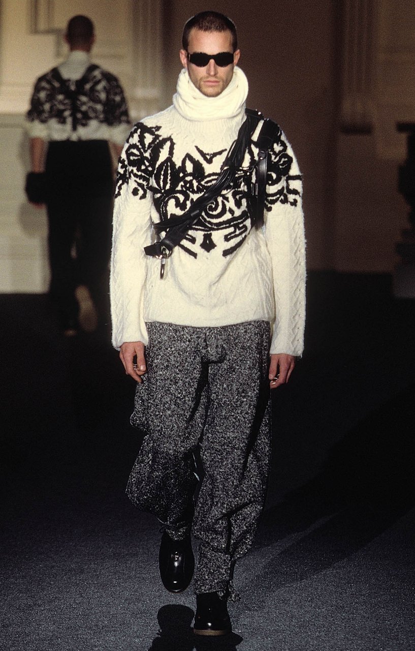 Pensando ai Pirenei o immaginando un viaggio nelle Alpi. Grandi cappotti trapuntati all’esterno, o paltò in pelliccia ruvida, né nappata né doppiata, tinta in kaki o in verde scuro; una giacca rilassata e chic di panno cotto - bianca o nera, da portare con la sciarpa candida; un pantalone, che è preciso oppure, all’opposto, risulta enfatizzato, anche per la pratica capienza delle tasche. Mentre i pullover sembrano tricottati a mano, oppure sono ricamati, fatti in una lana-stuoia dall’aspetto vissuto, aderenti sotto le giacche e i cappotti, o invece abbondanti e diritti come gli ski-sweaters di un tempo.