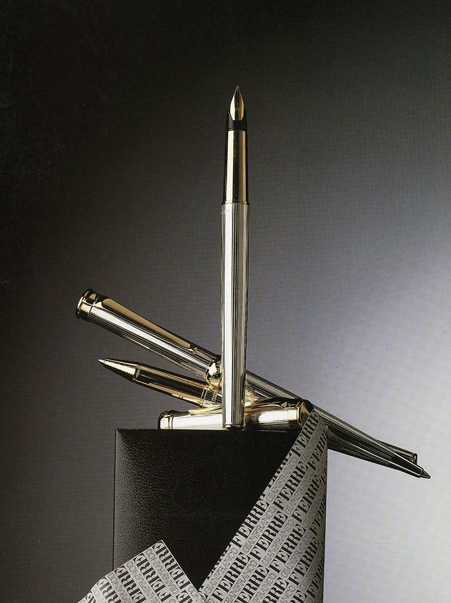 Tutti i modelli, realizzati in rutenio, lacca nera opaca, argento sterling 925, ottone placcato oro, sono costruiti con un sistema di assemblaggio ad incastro ed a vite, con minuterie in ottone dorato da orologeria ed hanno lo stesso diametro di mm 9,9 ed un anello dorato al bordo del cappuccio, che reca l’incisione del marchio Gianfranco Ferré”.