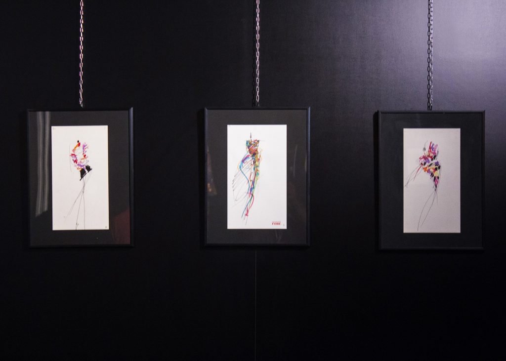La mostra rivela come il disegno, per Ferré, non fosse solo uno strumento per dare concretezza a un’idea, ma anche il punto di partenza per ogni progetto d’abito. Corpi stilizzati in linee, segni veloci sulla carta, tratti bold a matita o a pennarello, punteggiati qua e là dal colore. Un modo per “definire” l’abito, ma anche e soprattutto la donna pensata per indossarlo.