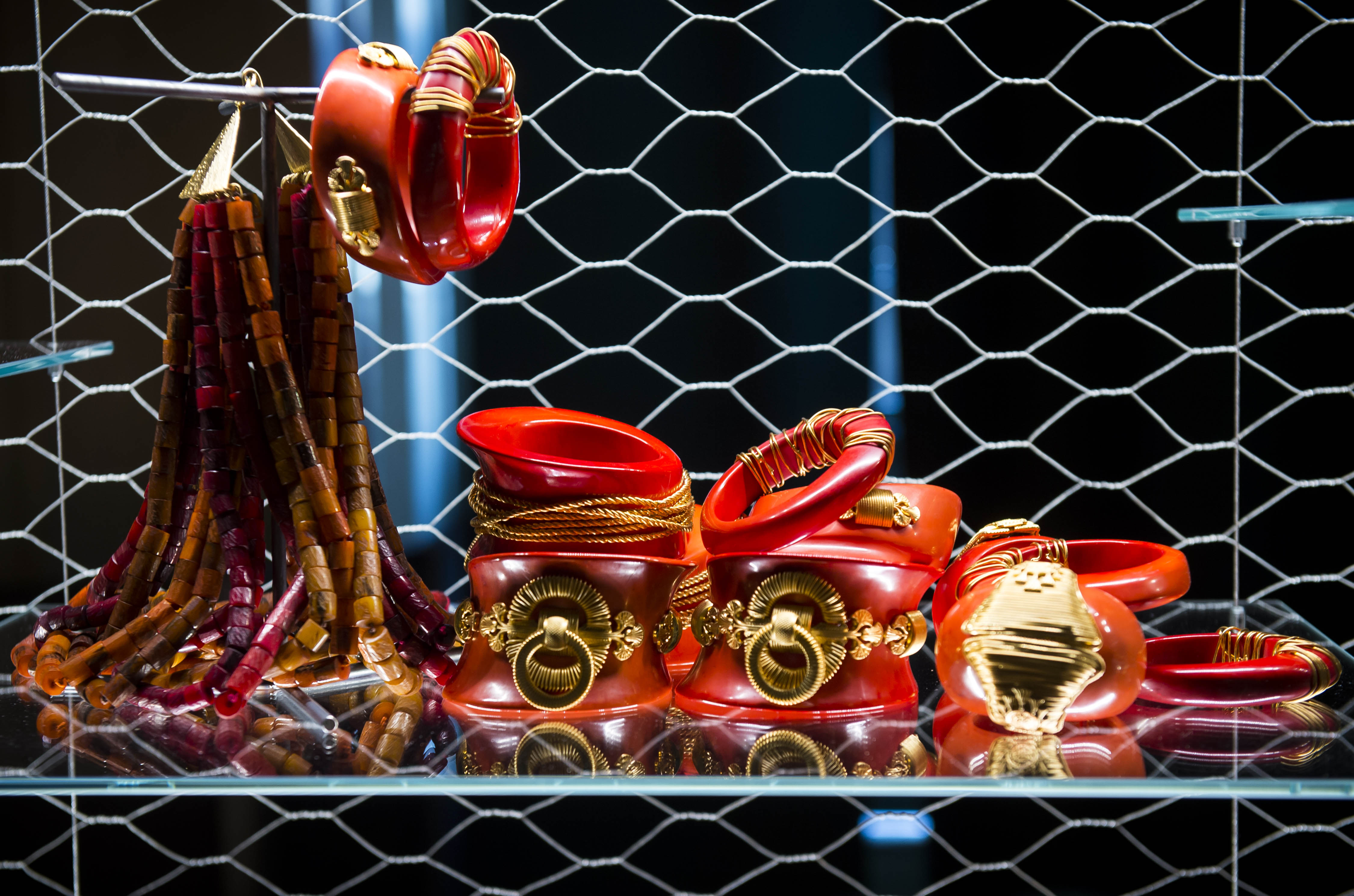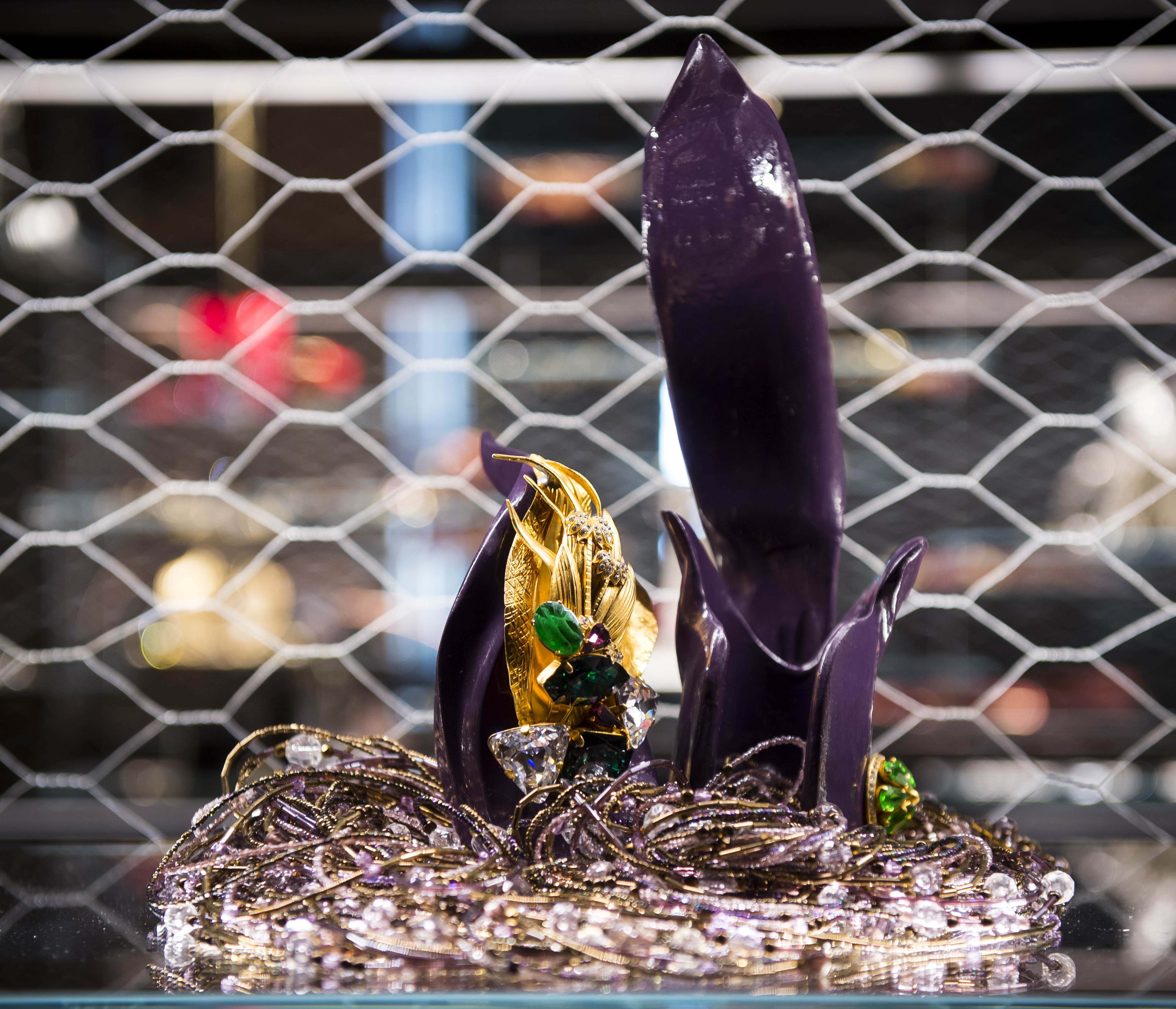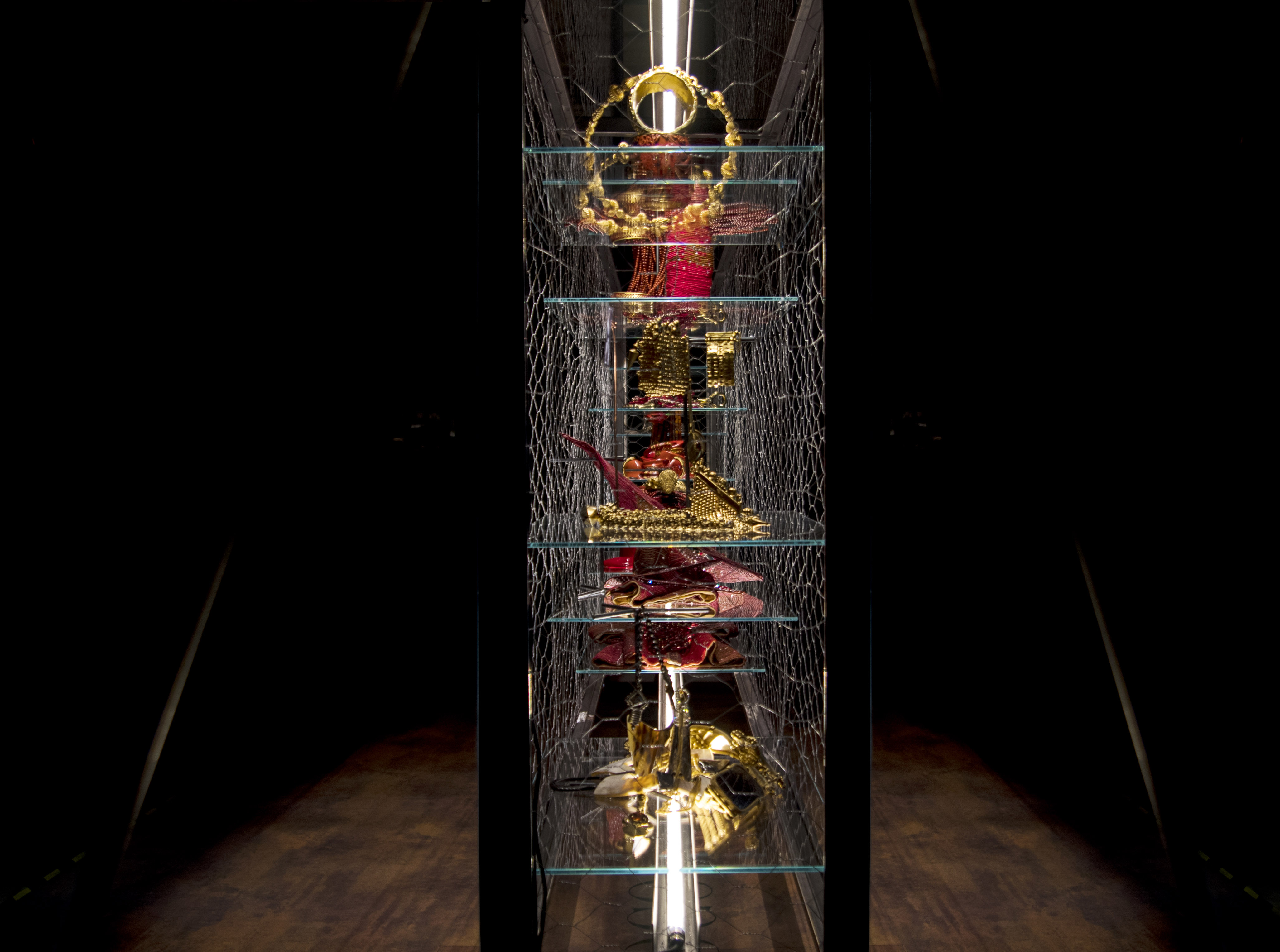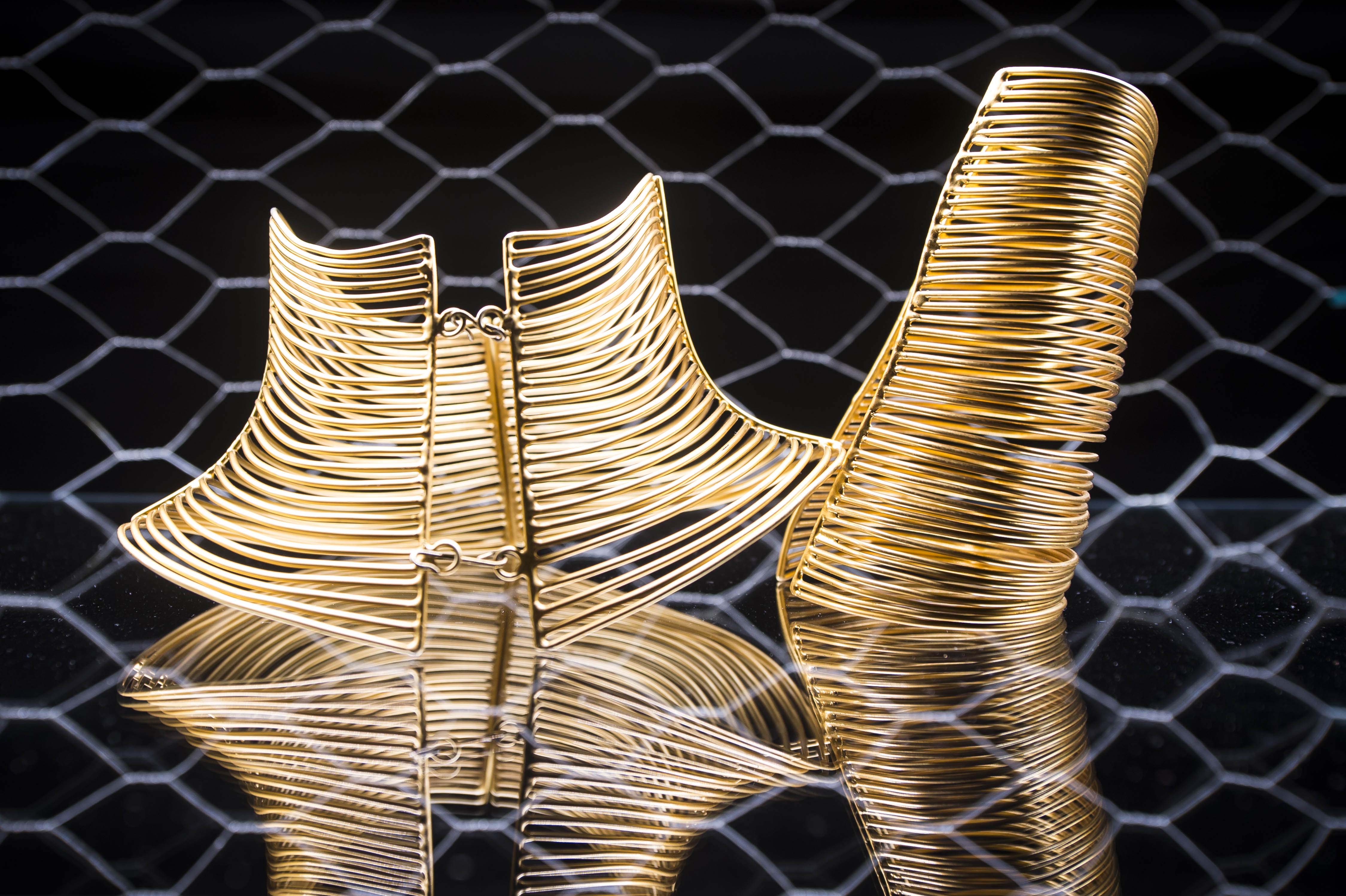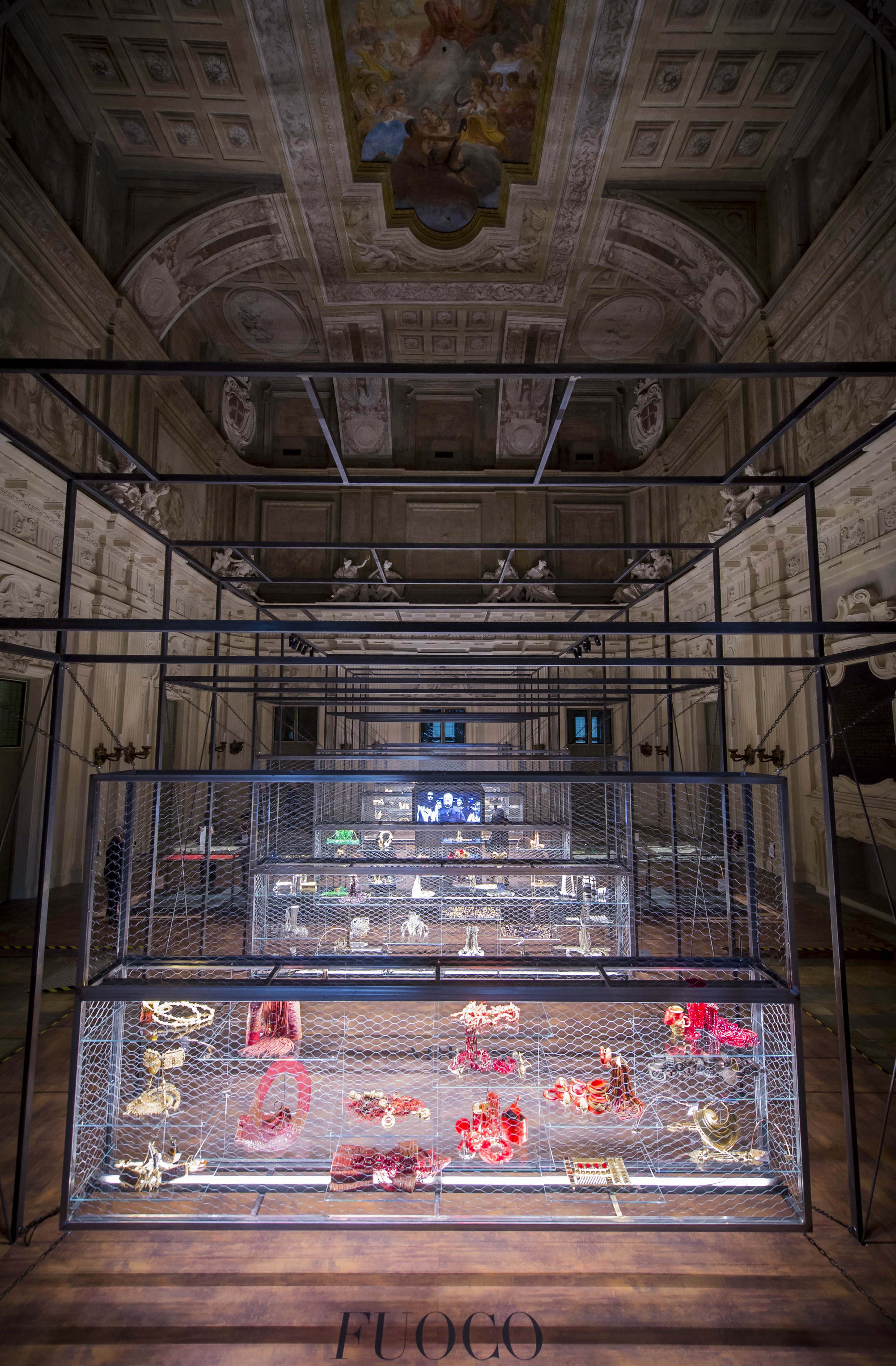 Per Ferré l’ornamento è stato sempre una passione, legata in modo inscindibile alle collezioni moda e risultato di un approccio appassionato e spesso innovativo, mai inferiore a quella riservata all’abito. Gli oggetti in mostra, realizzati per sfilate dal 1980 al 2007, sono raccontati come complemento dell’abito e suo accessorio ma vengono esposti insieme ad alcuni capi in cui è proprio la materia-gioiello a inventare e costruire l’abito, diventandone sostanza e anima. Anche in questo caso l’attenzione di Gianfranco Ferré ai materiali è determinante, come parte essenziale della sua ricerca. Il progetto espositivo – realizzato dall’architetto Franco Raggi – gioca sul contrasto tra la Sala del Senato di Palazzo Madama, ambiente di immenso pregio architettonico, e le strutture minimaliste ed essenziali in ferro e vetro dell’allestimento, mettendo in risalto la fantasiosa bellezza dei gioielli disegnati da Ferré che sembrano librarsi in volo nella penombra.