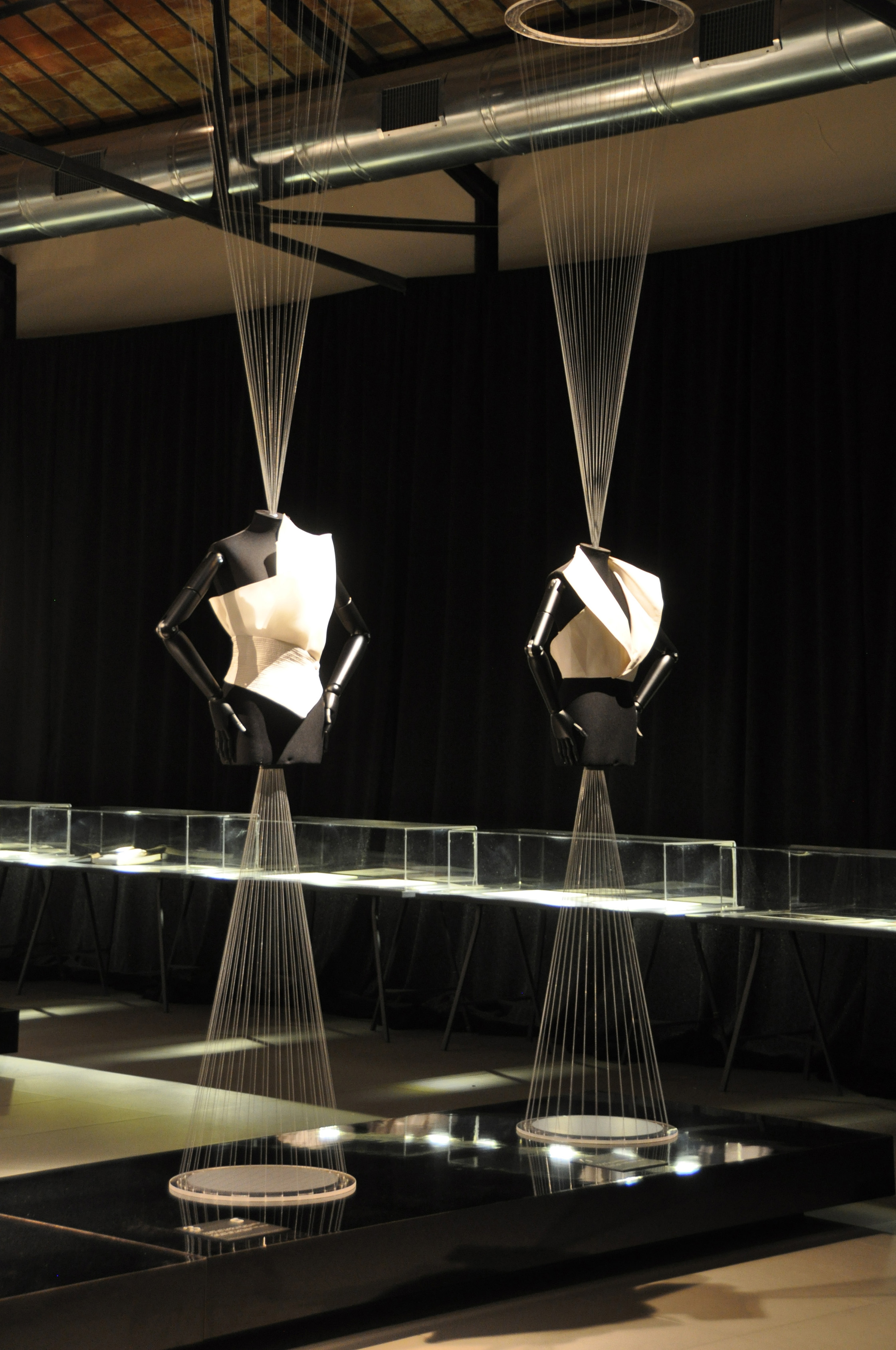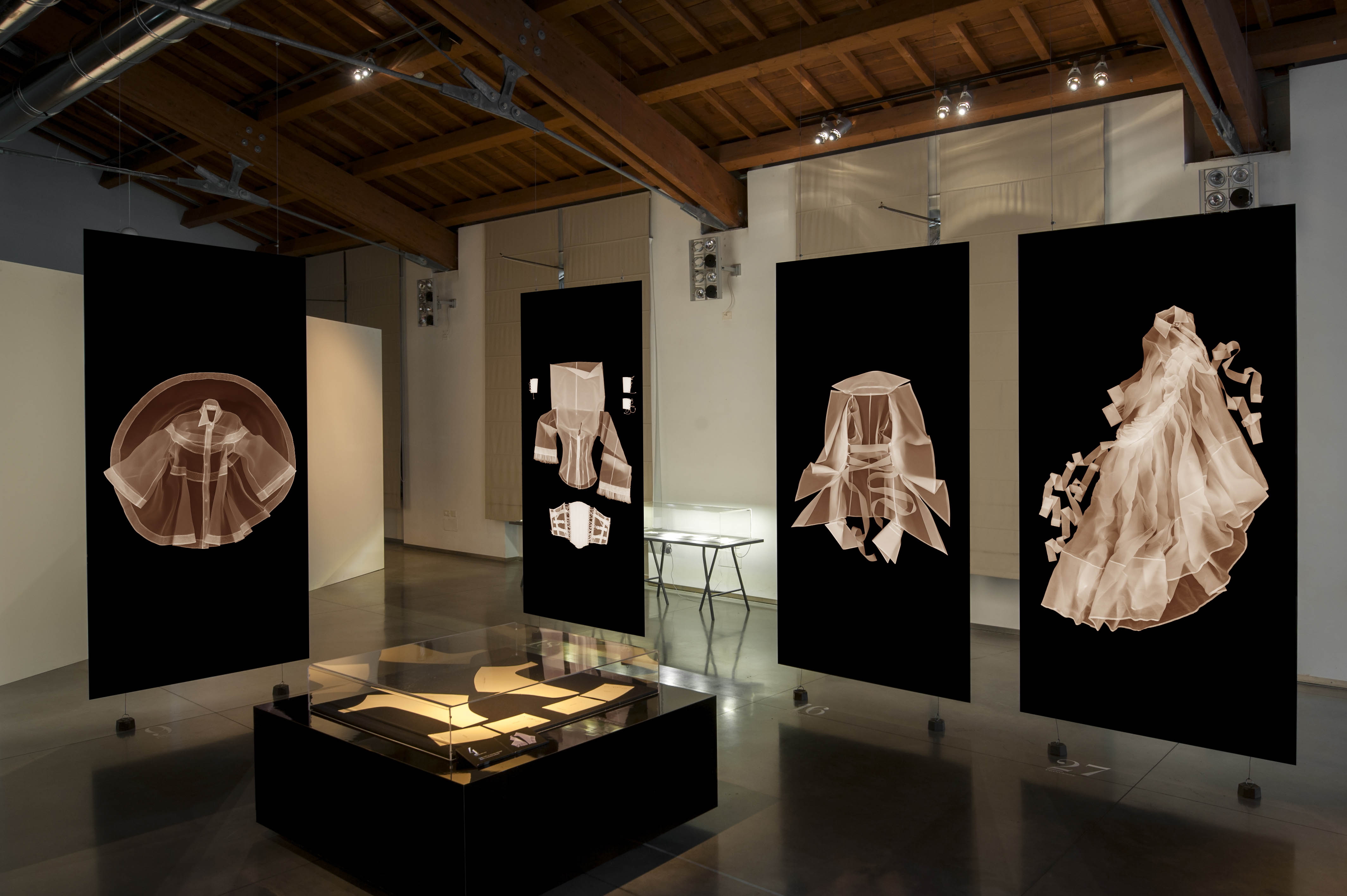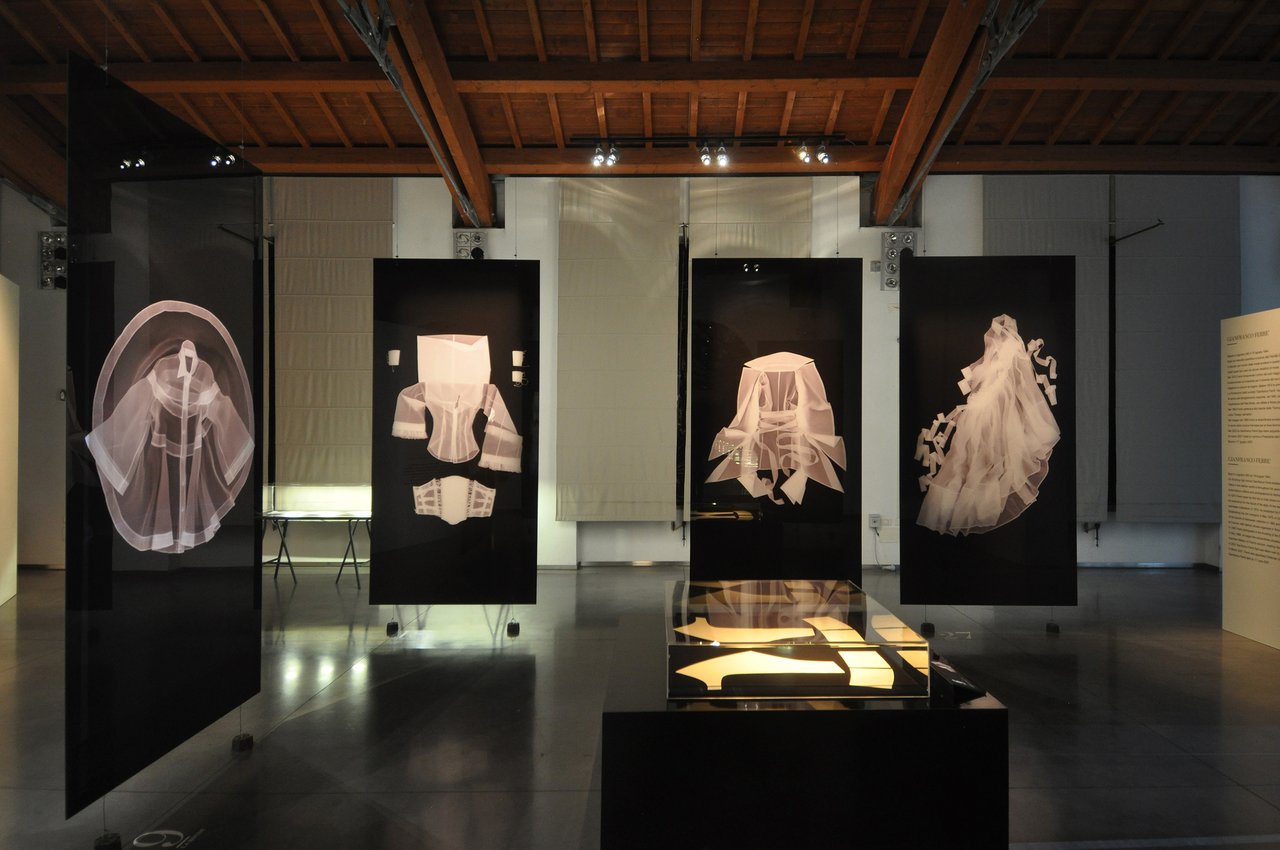 L’incipit della mostra è affidato ad un sistema sospeso di teli su cui scorrono macro-immagini dei disegni autografi di Ferré, lampi perfetti che delineano la sua visione creativa e che rappresentano la chiave per accedere all’universo insito a ciascun progetto. Nel primo ambiente emergono i canoni di costruzione e gli elementi strutturali innovativi della camicia attraverso il fascino inedito di macro-istallazioni fotografiche di Leonardo Salvini a simulare i raggi x, che offrono una lettura tecnica e poetica allo stesso tempo, di una selezione di capi, restituendo l’impalcatura formale e materica di ciascuna camicia e mettendo in evidenza texture e stratificazioni.