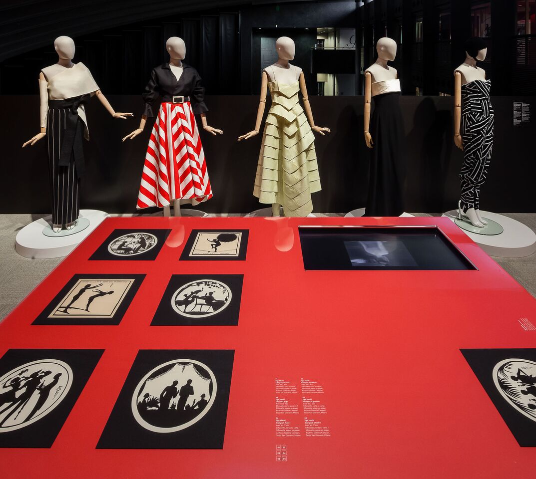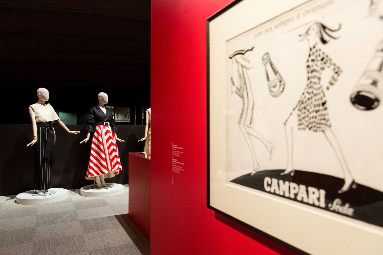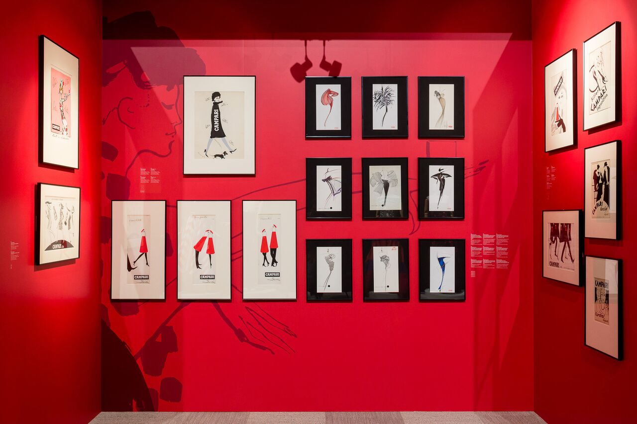 La curatrice Renata Molho declina questo percorso attraverso bozzetti pubblicitari, fotografie, grafiche, abiti, riviste e accessori. Divisa in quattro sezioni tematiche – Elegance, Shape and Soul, Futurismi e Lettering – la mostra mette in dialogo opere provenienti dagli archivi di Galleria Campari con prestiti da case di moda, musei e fondazioni. Tra rimandi estetici e di significato, accostamenti formali e cromatici, sono esposte opere originali pensate e realizzate per Campari da Fortunato Depero, Bruno Munari, Marcello Dudovich e Franz Marangolo, integrate con creazioni e bozzetti della Fondazione Gianfranco Ferré e con abiti-scultura della Fondazione Roberto Capucci.