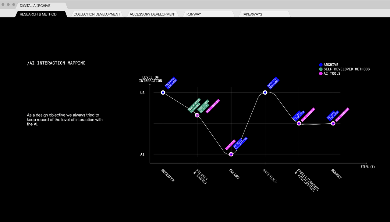 Il Centro di Ricerca Gianfranco Ferré promuove iniziative culturali ed educative basate sull’attivazione dell’archivio storico, coinvolgendo studenti e ricercatori nella sperimentazione di tecniche avanzate di visualizzazione, rappresentazione e fruizione di artefatti per sviluppare nuovi modelli di accesso e valorizzazione della legacy di Ferré. In questo contesto si inserisce Artificial A(I)rchive, progetto del Laboratorio di Sintesi Finale della Laurea Magistrale in Design for the Fashion System della Scuola del Design del Politecnico di Milano, che esplora come gli strumenti di Intelligenza Artificiale generativa possano amplificare il processo creativo di un progettista.
