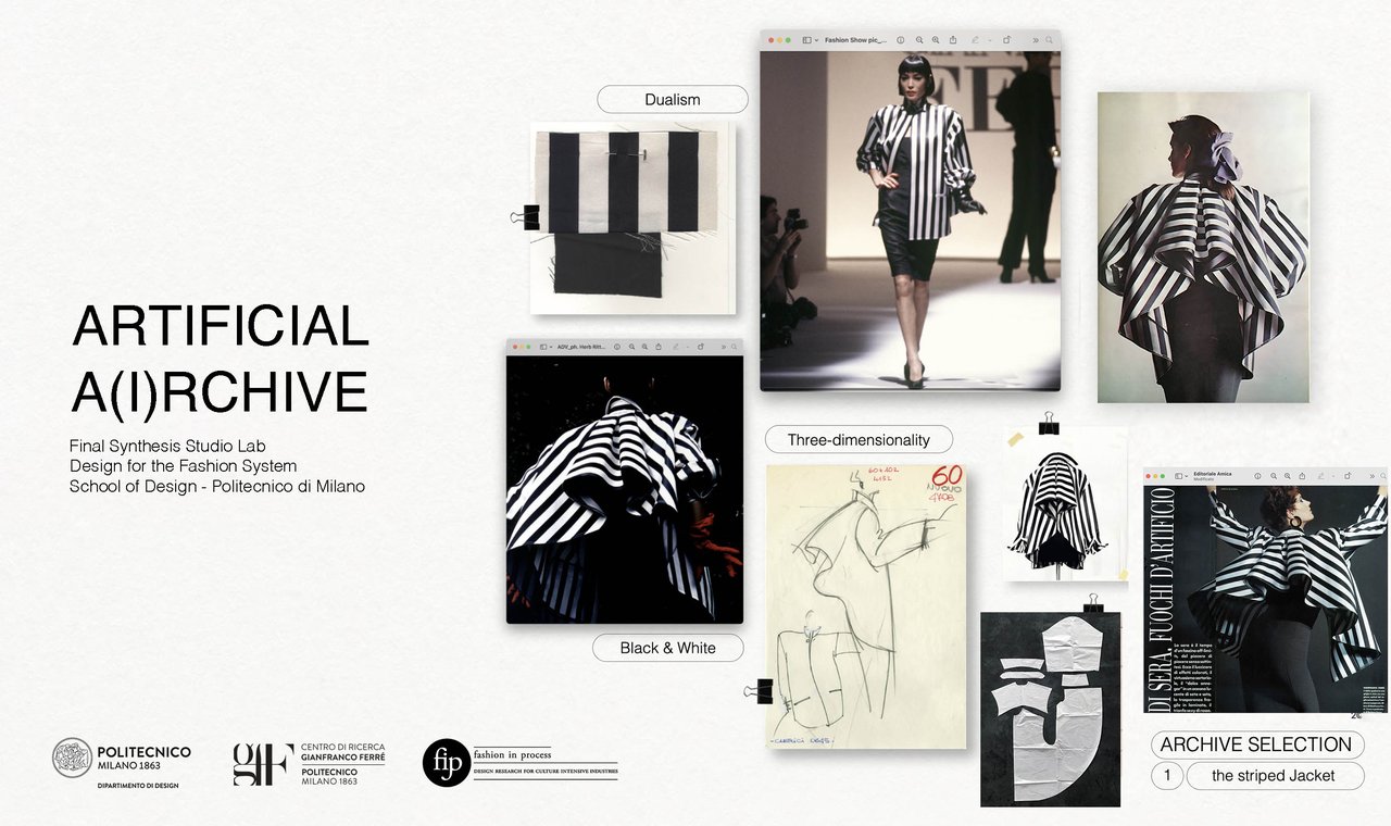 Il progetto prende avvio da un oggetto d’archivio, la Giacca a Righe della collezione Prêt-à-porter Autunno/Inverno 1985, da cui gli studenti sviluppano una capsule collection composta da tre outfit. Le fotografie d’archivio, i disegni originali, i cartamodelli e il linguaggio progettuale di Gianfranco Ferré proveniente dalla trascrizione delle sue lezioni, diventano input per strumenti di IA generativa come MidJourney, ChatGPT e The New Black, consentendo di definire un nuovo processo di co-creazione tra designer e intelligenza artificiale. L’obiettivo è indagare come la creatività umana e quella artificiale possano dialogare, ampliando l’autonomia progettuale e aprendo nuove opportunità e sfide per i giovani designer.