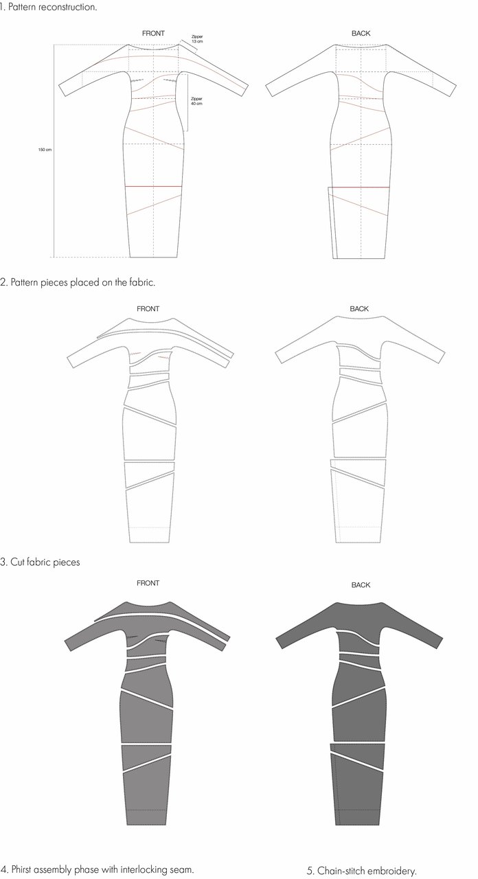 In questo contesto “Design with Memory” è un progetto di ricerca sviluppato da Diego Dani a partire da un capo d’archivio della collezione Gianfranco Ferré Prêt-à-porter Autunno/Inverno 1995-96 (look n. 82). L’analisi del capo, condotta attraverso un processo di reverse engineering, ha rivelato una complessa costruzione a intarsio composta da molteplici elementi applicati su una base in tulle elasticizzato semitrasparente, con un ricamo mano-macchina continuo a punto catenella in filo lurex, realizzato a capo finito. Tale tecnica mette in luce l’approccio alchemico di Ferré alla materia, fondato su una costante sperimentazione di tessuti e lavorazioni.