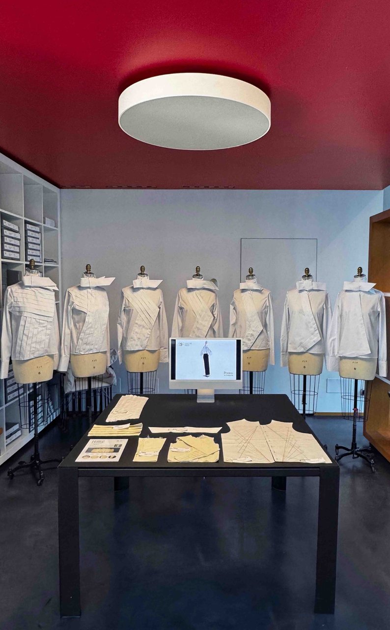 Attraverso la comprensione del “Lessico Ferré”, ogni gruppo di studenti ha reinterpretato e riprogettato i codici estetici e costruttivi dello stilista, traducendo logiche strutturali, composizioni volumetriche e dettagli sartoriali in nuove proposte contemporanee a partire dal modello base della Polishirt. Questo approccio progettuale, fondato sulla sinergia tra ricerca d’archivio e sperimentazione modellistica, ha favorito l’acquisizione di competenze progettuali nella costruzione del capo, conducendo alla realizzazione di prototipi originali, ma coerenti con la visione progettuale di Ferré.