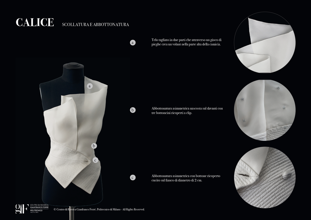 A partire dallo studio delle camicie bianche d’archivio – archetipi formali e simbolo del pensiero progettuale di Gianfranco Ferré – gli studenti sono stati coinvolti in un percorso di ricerca e reinterpretazione dei codici estetici e costruttivi dello stilista. Ogni camicia è stata oggetto di attento studio, condotto sia sul capo d’archivio originale sia sul ricco materiale documentale messo a disposizione dal Centro di Ricerca Gianfranco Ferré: disegni tecnici, disegni uscita sfilata, foto di sfilata e di campagne pubblicitarie, oltre alla fotografia immersiva a 360° della camicia stessa.
