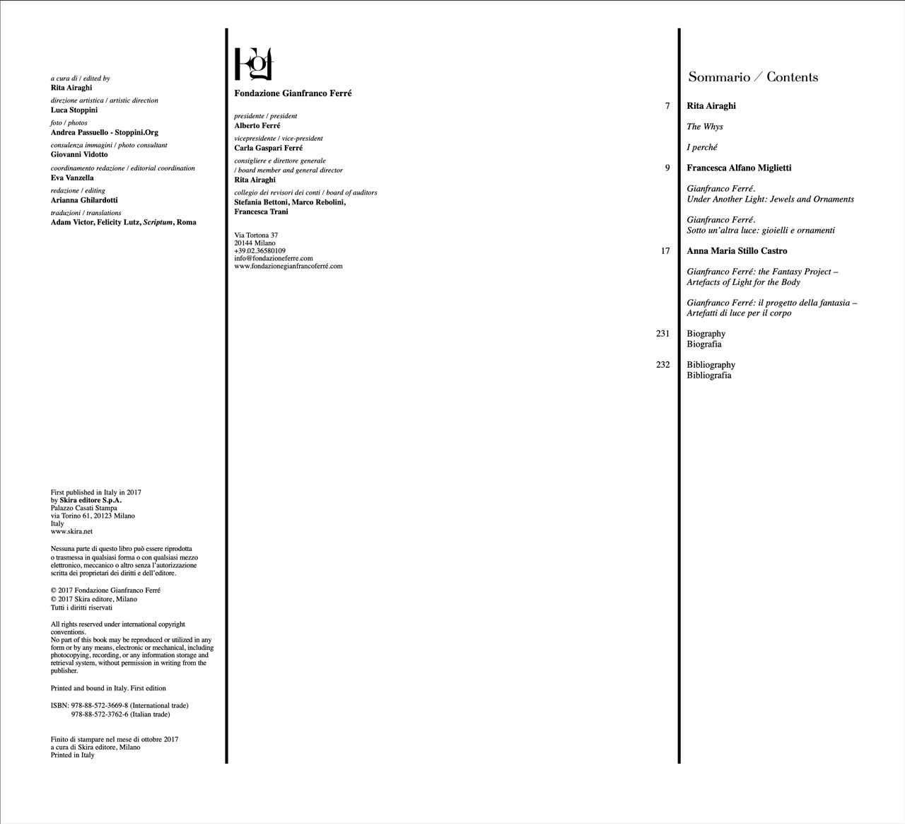 Questo libro è anche un doveroso tributo all’inizio del percorso di Ferré, che trova proprio negli ornamenti, nei bijoux e negli accessori la sua prima tappa. Una partenza motivata più dalla curiosità che da una convinzione già consolidata, più dal piacere di manipolare la materia che non dalla determinazione di diventare stilista, maturata solo diversi anni più tardi.