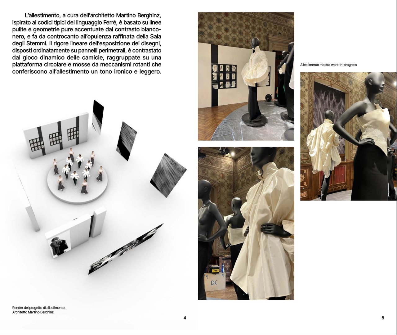 L’esposizione illustra la visione di Gianfranco Ferré attraverso una selezione di disegni e abiti. I disegni, organizzati in sezioni tematiche, evidenziano alcuni principi fondamentali del design che hanno guidato il suo processo creativo, introducendo la sua personale “metodologia”. Accanto ai disegni è presentata una selezione del suo capo iconico, la camicia bianca, che propone un percorso esperienziale nella ricerca stilistica di Ferré, dove quei principi si concretizzano in infinite variazioni del modello.