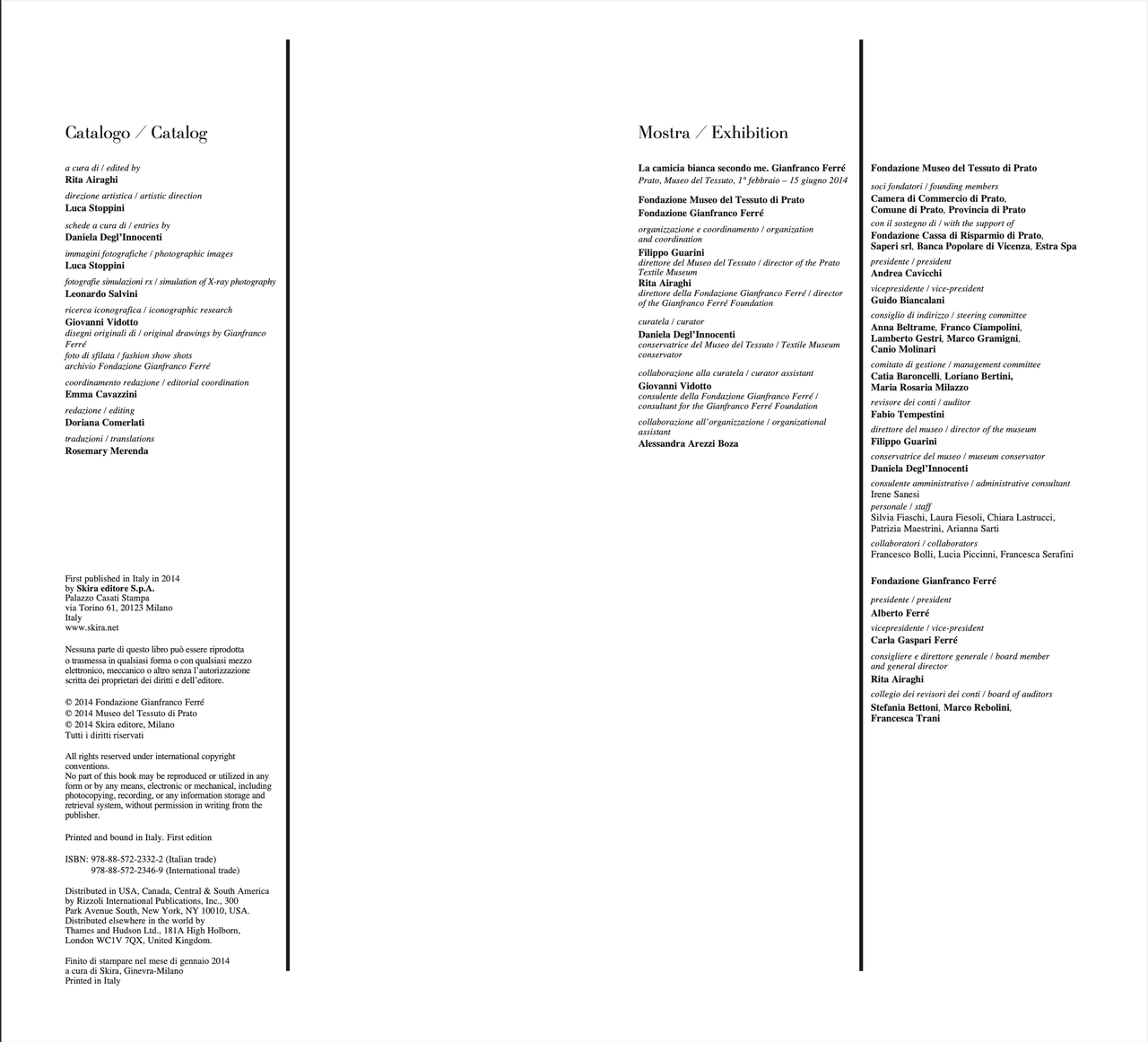 In perfetta sintonia con il concept espositivo, il volume Skira presenta un contenuto articolato in molteplici elementi che valorizzano la camicia bianca e offrono una visione della progettualità di Gianfranco Ferré applicata a questo capo iconico, mettendo in evidenza gli elementi costruttivi più innovativi e le sue infinite e affascinanti interpretazioni.