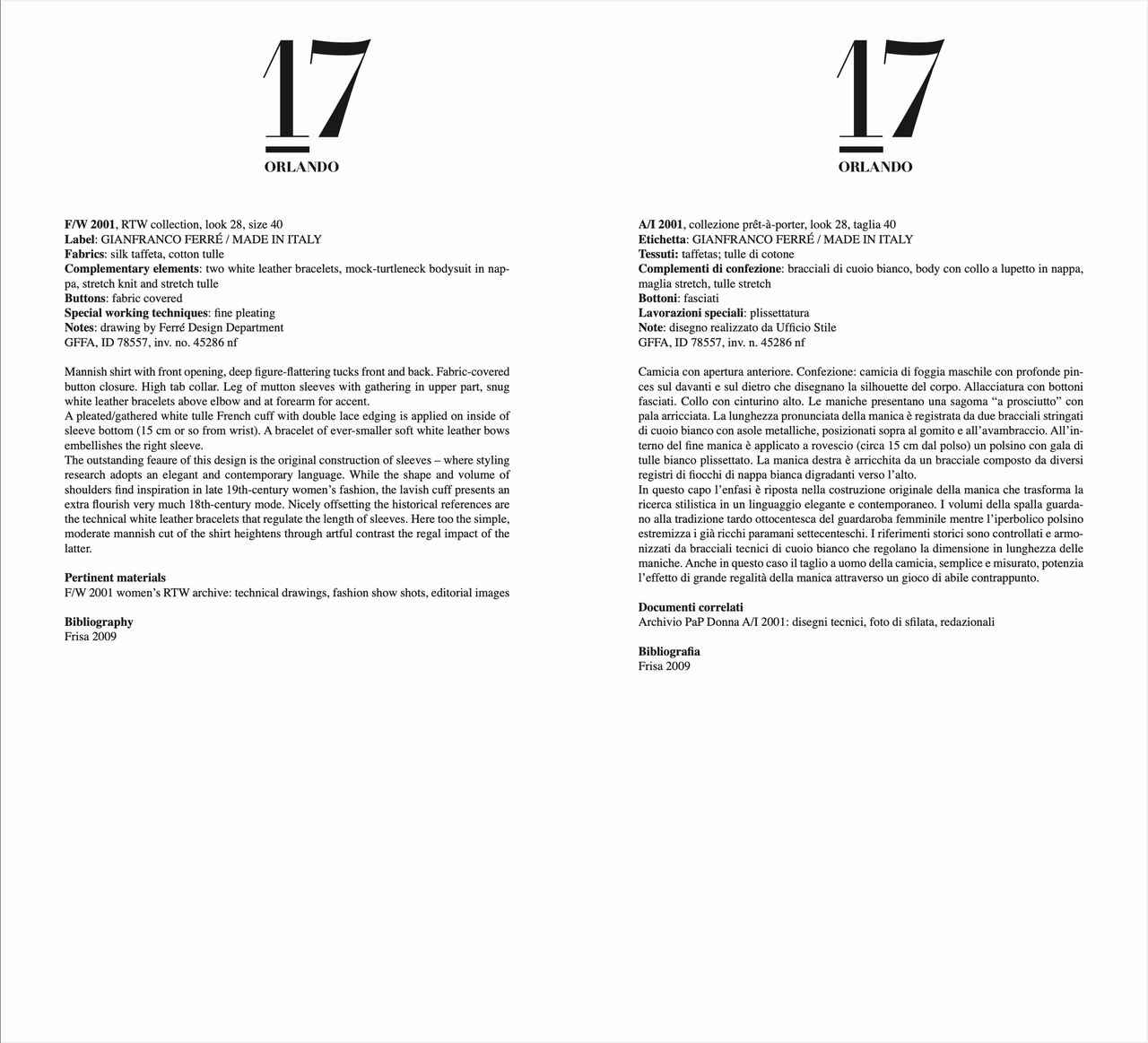 Il catalogo comprende contributi e approfondimenti di protagonisti dello stile, della moda e dell’architettura italiana; una sequenza di immagini fotografiche di Luca Stoppini; una serie di simulazioni x-ray realizzate da Leonardo Salvini – frutto di una ricerca tecnica sviluppata in collaborazione con l’Opificio delle Pietre Dure di Firenze; disegni e bozzetti originali di Gianfranco Ferré e fotografie di passerella. Parte integrante del volume sono le 27 schede a cura di Daniela Degli Innocenti.
