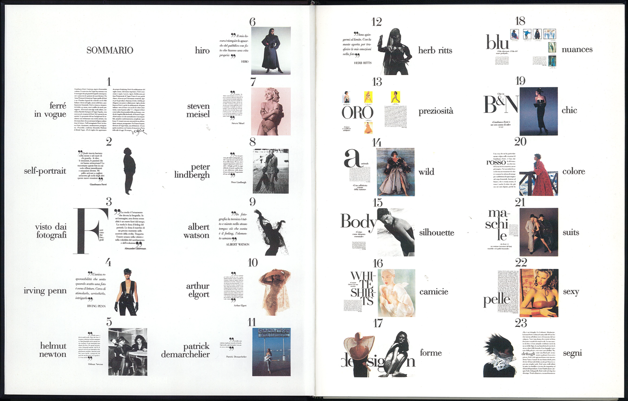 Il volume, curato dalla redazione di Vogue Italia e pubblicato nel 1993, è dedicato a Gianfranco Ferré e ne restituisce il profilo creativo attraverso un ampio repertorio iconografico. Il libro raccoglie immagini provenienti da tutte le edizioni internazionali di Vogue, firmate da alcuni tra i più grandi fotografi della moda, tra cui Helmut Newton, Peter Lindbergh, Steven Meisel e Albert Watson.