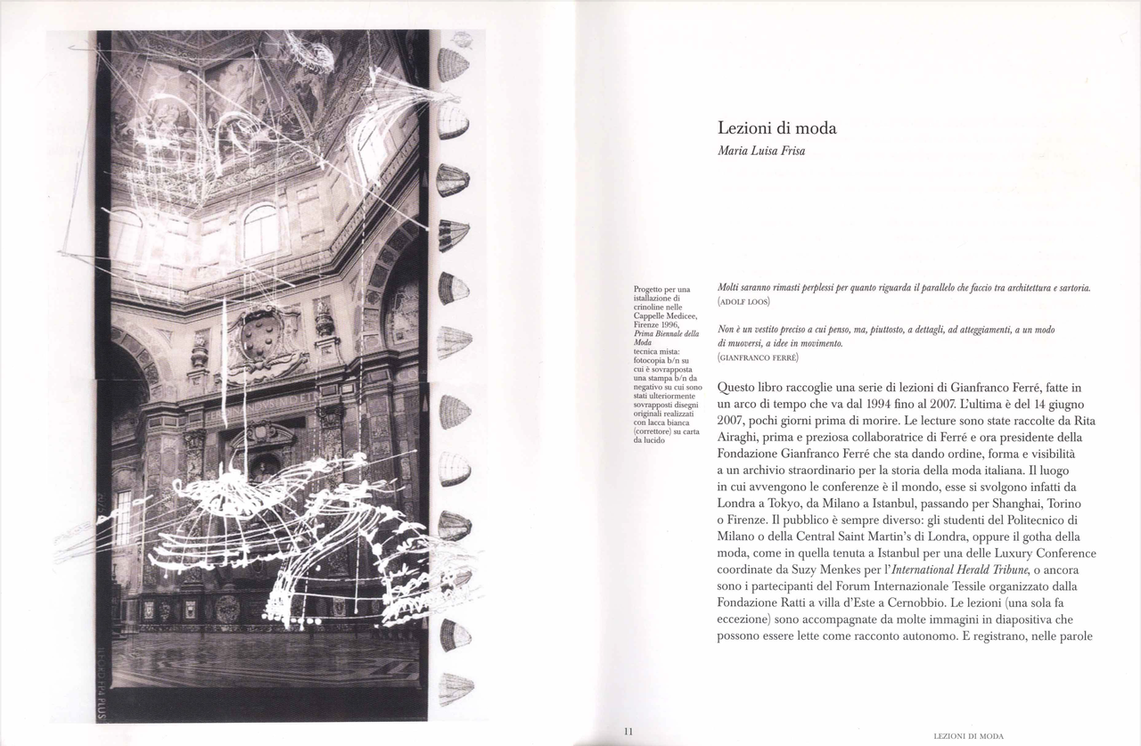 Il volume è il primo a rivelare in modo organico l’ideologia della moda di uno dei più importanti designer italiani. Gianfranco Ferré, conosciuto come l’architetto della moda – si era laureato in Architettura al Politecnico di Milano – ha tenuto nel corso della sua carriera centinaia di lezioni in istituzioni accademiche di tutto il mondo. Quelle lezioni, oggi conservate, sono riunite in questo libro insieme a una selezione inedita di schizzi e fotografie, offrendo una testimonianza diretta, originale e rigorosa del suo pensiero sulla couture.